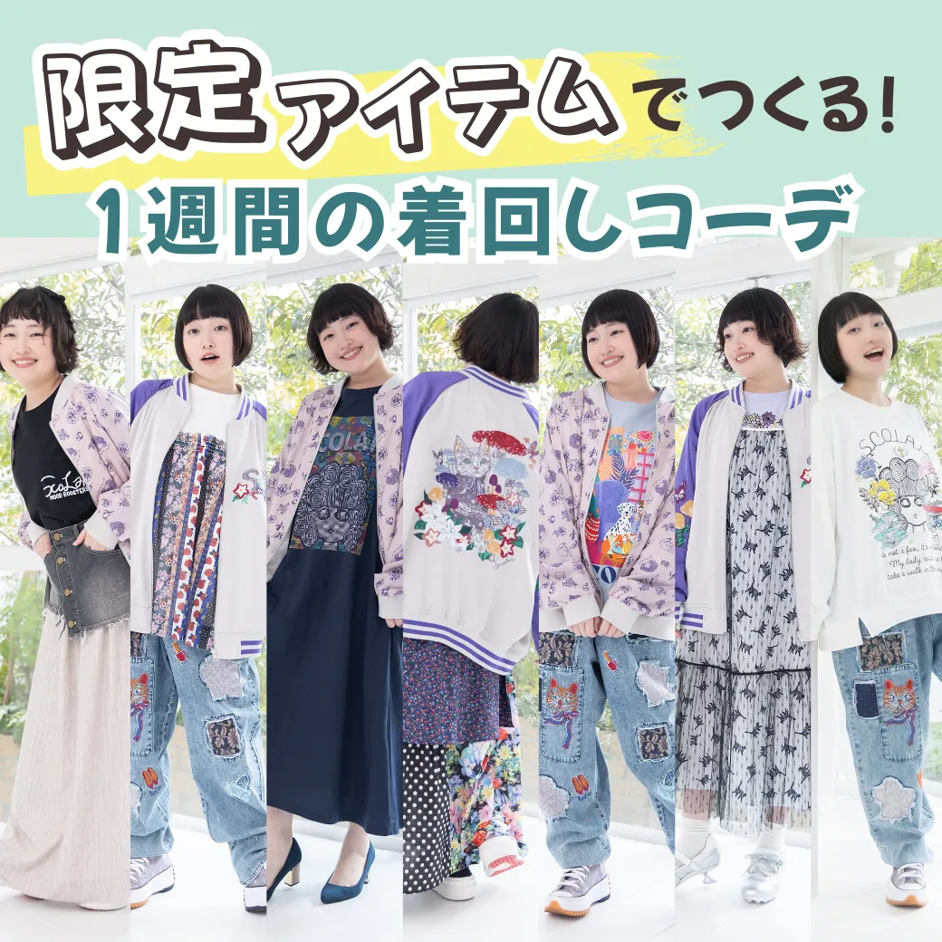 ▲ネコ柄プリントにドットチュールを重ねた大胆なデザインのトップスに、カラフルな総柄パンツを合わせた存在感たっぷりのコーディネート。お花の中にひょっこり隠れたネコちゃんがとってもキュート♡ さらによく見ると、パンツの花柄の中にもネコがこっそり隠れているのがポイントです。