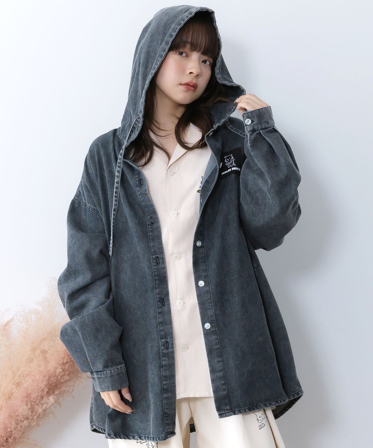 【モデル着用】(左)アウター:花ネコ柄ジャージ×デニム 異素材切替ブルゾン ¥ 15,950(税込) / (右)パーカー:正月太りネコ柄デニムorチェックシャツパーカー ¥ 11,990(税込)